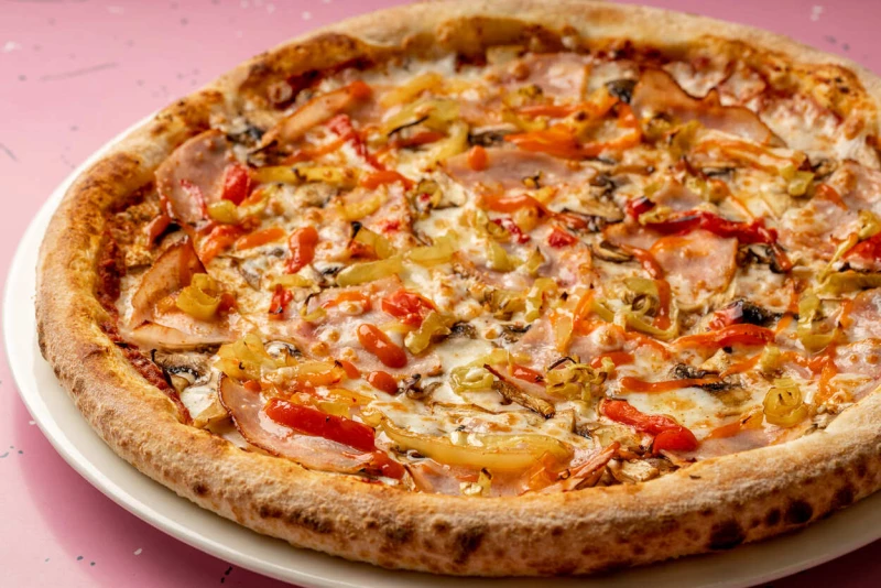 Тесто на пшеничной муке, сыр Моцарелла, ветчина, грибы шампиньоны, перец маринованный, перец халапеньо, оливки, орегано. Соус в основу пиццы на ваш выбор томатный или сливочный.