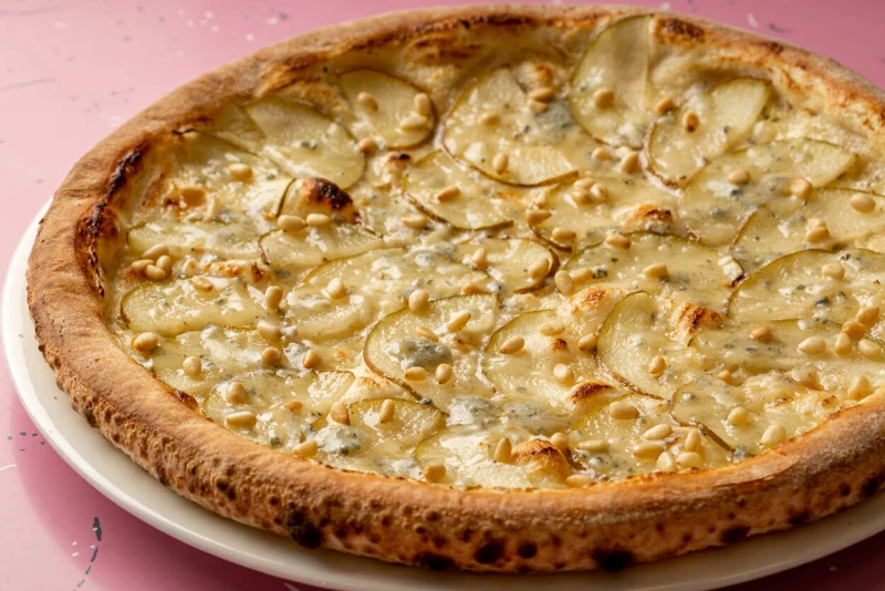 Тесто на пшеничной муке, груша, кедровый орех, сыр Дор Блю, мед. Соус в основу пиццы сливочный.